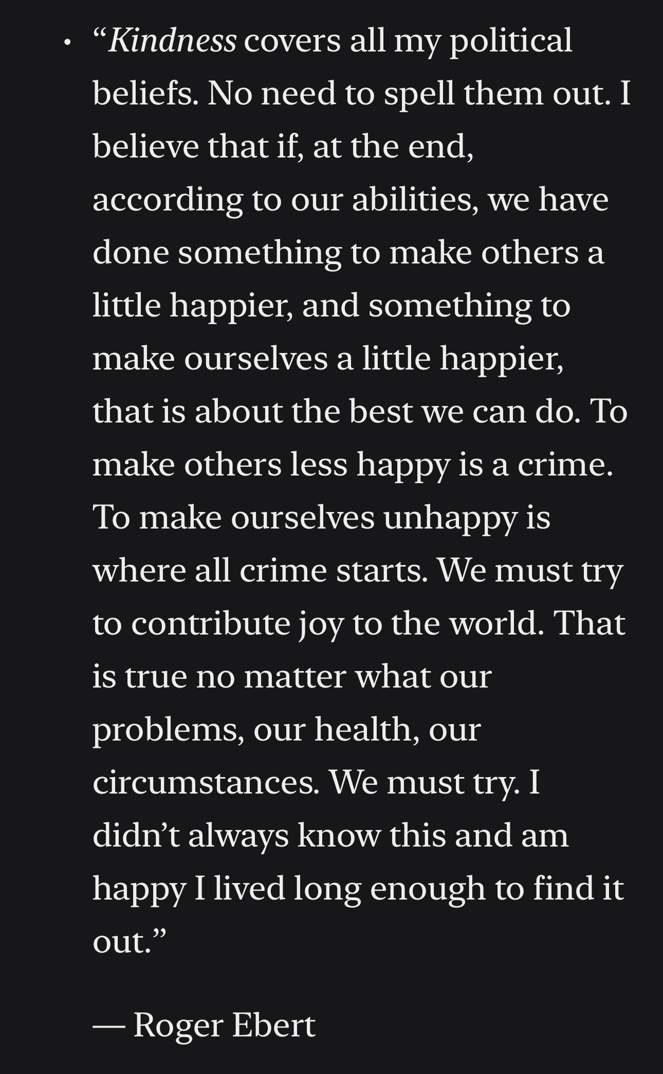 I spent a lot of time in my youth watching and reading Roger Ebert. You probably won’t be surprised to learn that I watched Roger Ebert and Gene Siskel on Sneak Previews on PBS before they made it big with At the Movies in 1982. I’m glad to see I had good taste even then. I found this Roger Ebert quote this week that resonated with me.