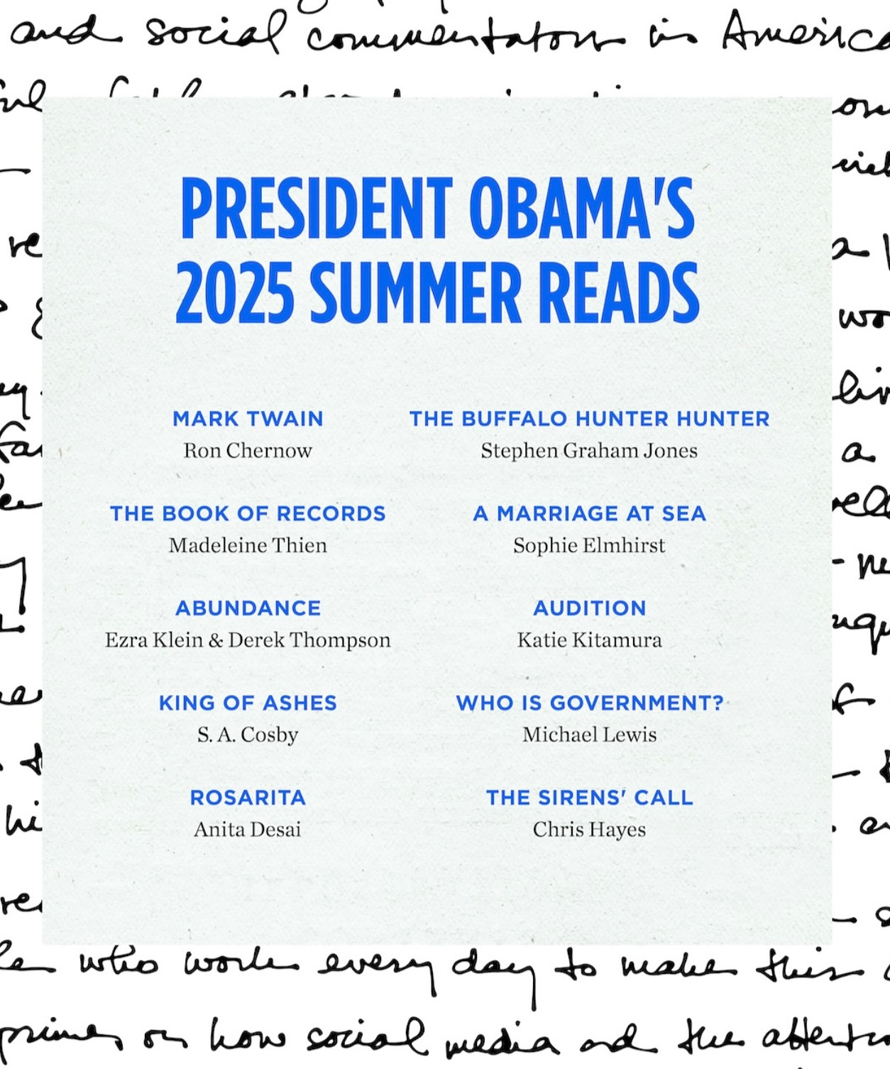 President Obama’s Summer Reads. It’s that time of year! Obama has incredible taste in books. I’ve read a couple on this year’s list (outstanding). I REALLY want to read Ron Chernow’s Mark Twain, but that baby is 1,200 pages. That might best be saved for the dark winter months.