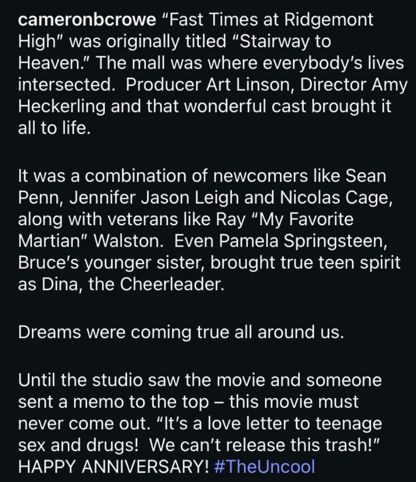 Here’s yet another installment in my effort to revisit songs, bands, or music videos from the ‘80s and early ‘90s that merit a closer look. I think it goes without saying that Fast Times had a superior movie soundtrack given Cameron Crowe’s involvement. I would just like to include my personal favorite scene from Fast Times, which includes the song “Raised on the Radio” by The Ravyns, a Baltimore-based power pop band. An underrated song for sure, and Brad washing his car to the tune is so delightful. And at the end of the scene when he tells his sister, Stacy, “I take out the garbage”? Well, anyone raised with an older brother will appreciate this exchange.